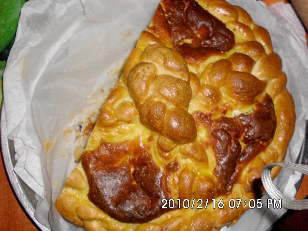 Se framanta un aluat din ingredientele de mai sus,se lasa 1 ora la dospit.Pana atunci branza se amesteca cu cele 2 oua,Cand aluatul a dospit il impartim in trei bucati egale,una o punem pe fundul tavei,apoi punem un start de branza.Din celelalte 2 bucati impartim iarasi cate 3 si facem serpisori lungi din care impletim.O impletitura o punem pe margine,iar din cealalta facem o cruce,intre spatiile ce raman adaugam branza.O lasam la cuptor cam 40-50 min.Inainte cu 5 min sa o scoatem o ungem cu ou batut!