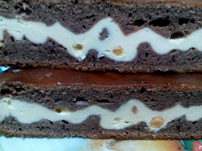 Aceasta pasca este putin deosebita de pasca cu aluatul de cozonac avand baza un aluat de chec de ciocolata.Este foarte delicioasa si eu as spune ca este o alternativa destul de usoara si buna.Intai vom pregati asa zisul blat pentru pasca.Vom mixa ouale cu zaharul bine, pana cand compozitia va deveni ca o crema apoi vom adauga uleiul, esentele, sarea, laptele caldut, faina amestecata cu cacaua, praf de copt si amoniacul dizolvat intr-o lingura de otet sau zeama de lamaie.Se amesteca totul bine, pana se omogenizeaza, apoi se imparte compozitia in doua.Captusim o tava dreptunghiulara suficient de mare, cu peretii mai inalti de preferat, cu hirtie de copt, apoi vom turna in ea jumatate din compozitia de chec.