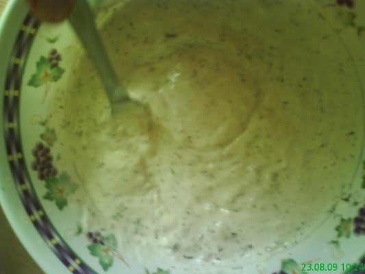 Se amestecă peştele mărunţit cu maioneza, ceapa şi sarea.