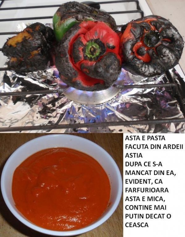 Se pun la copt ardeii, apoi se pun cu sare in punga de plastic pana se racesc destul sa nu te arda, (ei se aburesc acolo si coaja se ia imediat). Se curata de cotor si samburi dupa care se pun ardeii in robotul de bucatarie impreuna cu 3-4 catei de usturoi mari, o lingura de ulei, doua de otet, un pic de sare si se mixeaza. Rezulta o pasta delicioasa, fina ca maioneza la consistenta, cu gust de ardei copti – buna de pus in farfurie peste friptura sau de uns pe felia de paine peste salata de vinete sau de pus in sandviciuri sau de mancat pur si simplu asa pe paine ca gustare rapida, etc.