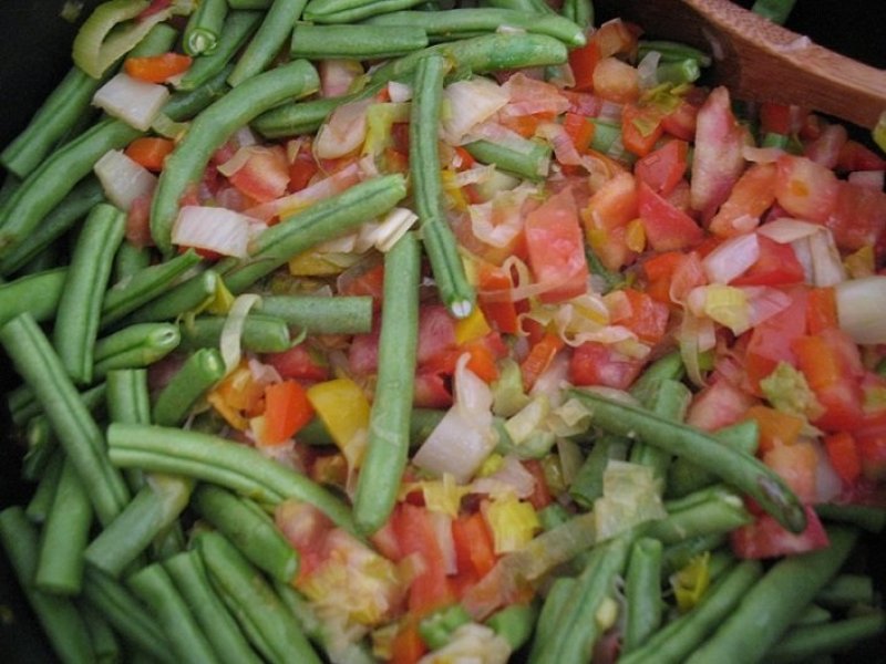Spalati prazul și taiati-l rondele dupa care il prajiti putin in ulei, adaugati feniculul taiat marunt, ardeiul taiat cuburi iar dupa 5 minute adaugati si rosiile taiate marunt. Dupa 1-2 minute adaugati pastaile curatate, spalate si taiate in jumatate. Condimentati cu sare dati focul incet, acoperiti si lasati sa fiarba 20 minute amestecand din cand in cand.