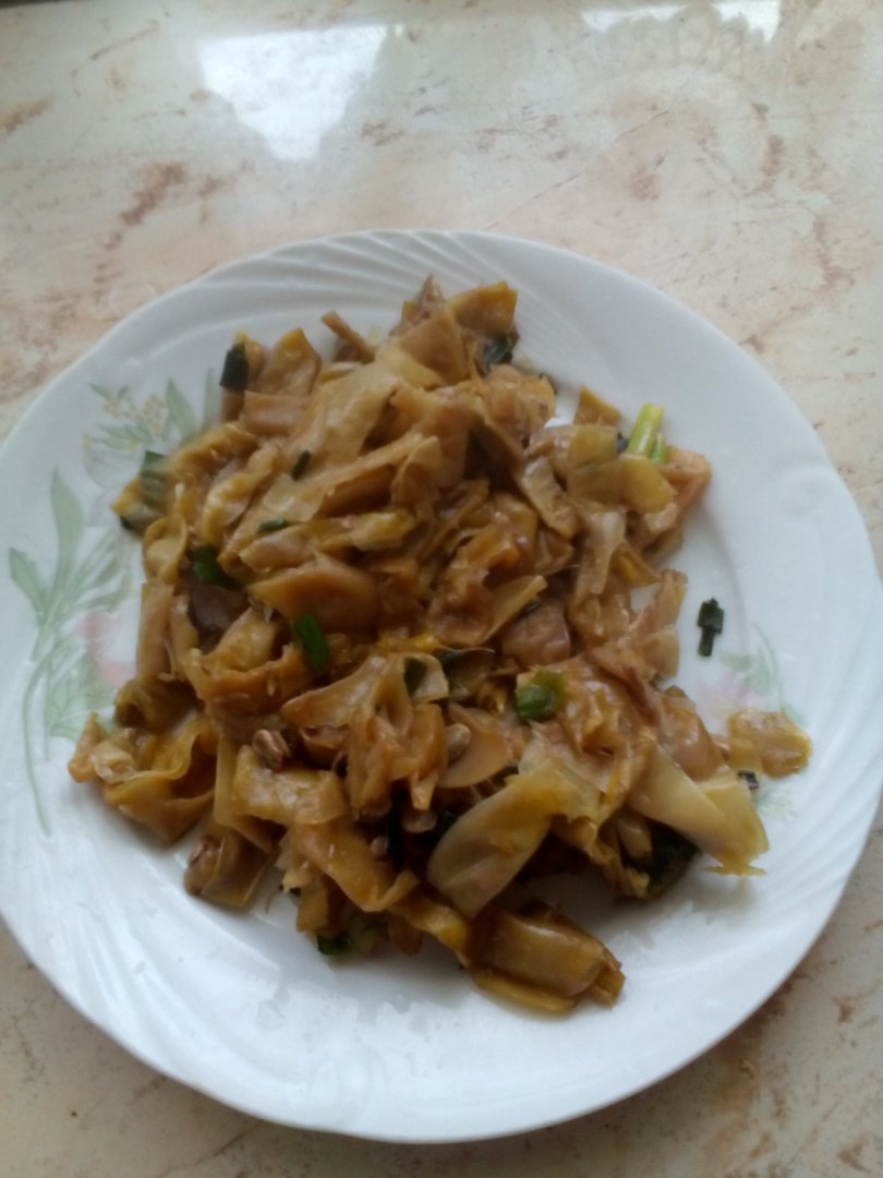 Se pun pastaile la fiert, in apa cu sare. Se pune uleiul in tigaie si se adauga ceapa taiata marunt si se caleste. Se adauga pastaile si sosul soia. Se lasa 10 min la foc mic, mestacandu-se din cand in cand. Se adauga patrunjel verde.