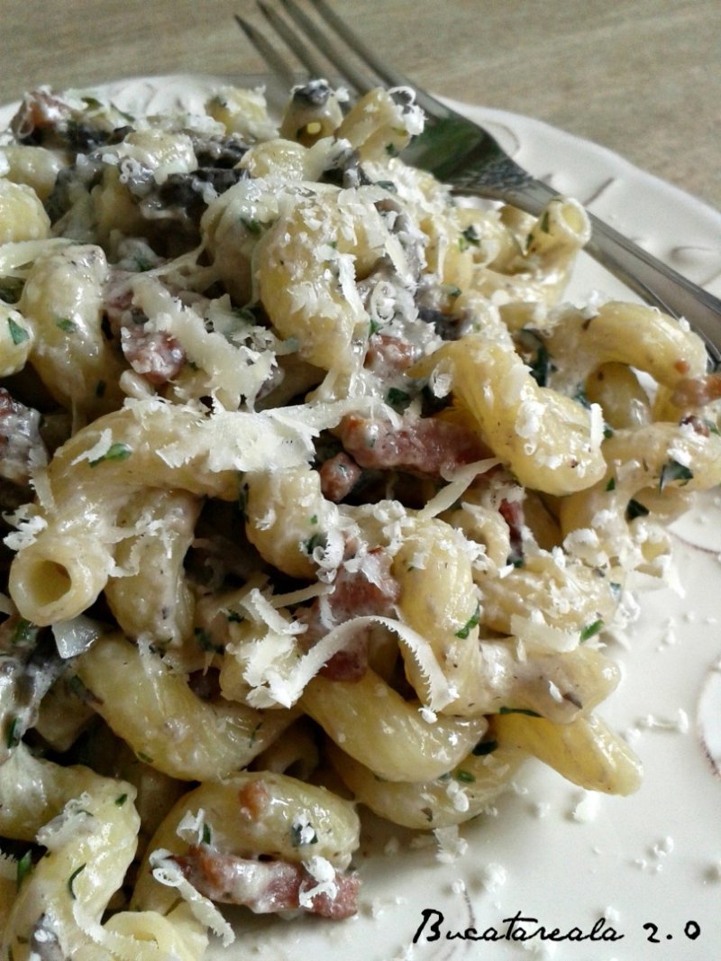 Baconul, taiat cubulete, se caleste intr-o tigaie antiaderenta, fara adaos de ulei (lasa oricum multa grasime), dupa care se adauga ciupercile, taiate felii. Se asezoneaza cu sare si piper. In ceea ce priveste sarea, este bine sa o adaugati spre final, cand puteti gusta amestecul, caci baconul poate fi suficient de sarat pentru toata mancarea. Cand s-a evaporat toata zeama lasata de ciuperci, se adauga usturoiul pisat, se caleste aproximativ 1 minut, dupa care se adauga smantana. Se mai tine pe foc cat sa se ingroase putin, aproximativ 5 minute, dupa care se adauga patrunjelul tocat si se amesteca cu pastele fierte si strecurate. Daca este nevoie, se mai poate adauga putin din apa in care au fiert pastele. Cel mai bine este ca atunci cand strecurati pastele, sa pastrati o cana din apa in care au fiert, just in case.