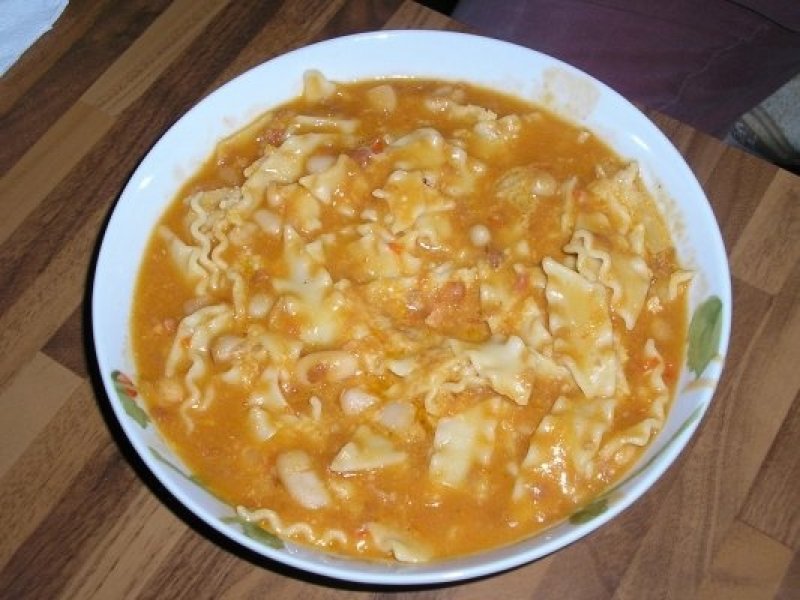 Preparare: se toaca marunt ceapa si costita. Intr-o oala se pune putin ulei si se frige costita cu ceapa tocate circa 3-4 minute. Se adauga jumatate din cantitatea de fasole, sosul de rosii, apa si cubuletul de concentrat si se fierbe 30 de minute. Dupa 30 de minute se adauga pastele si restul de fasole, se sareaza si pipereaza si se fierbe ptr timpul indicat pe punga de paste. Se serveste cu un strop de ulei de masline si un pic de parmezan.....pofta buna