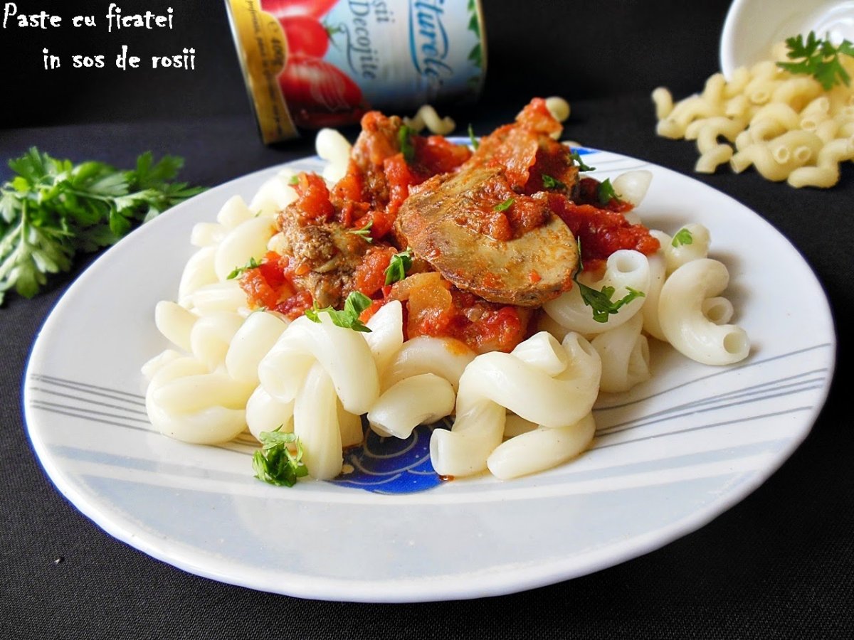 Pastele le servim cu ficateii in sos si presaram patrunjel verde toct desupra.