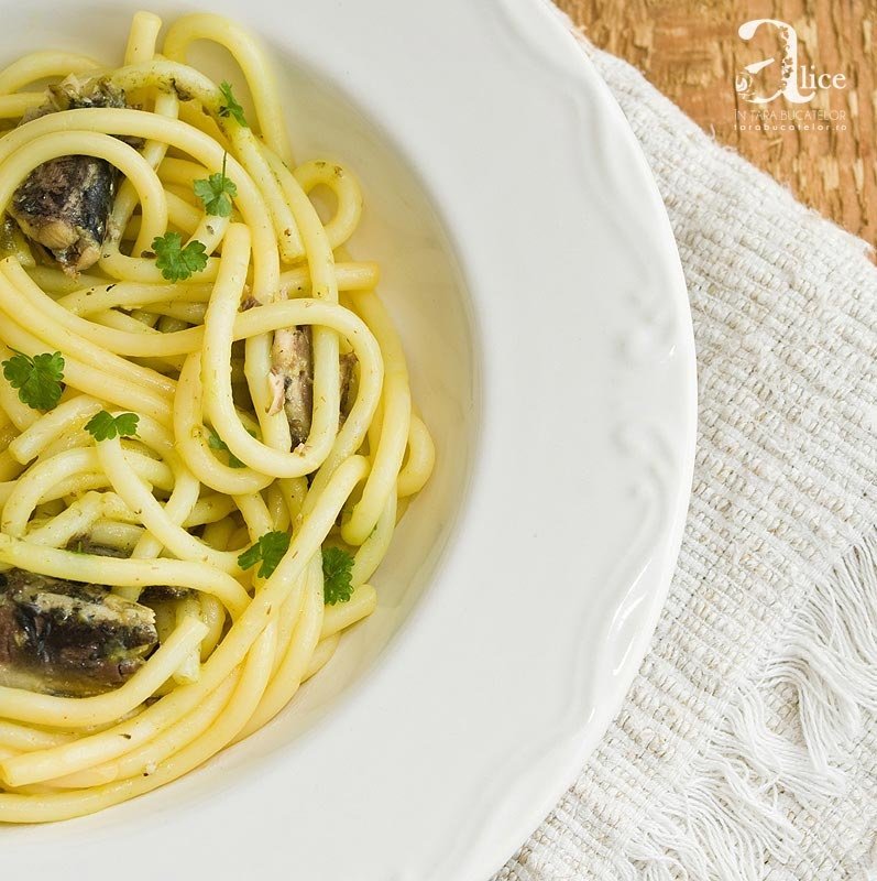 Intre timp incingeti uleiul de masline si adaugati usturoiul strivit. Amestecati usor si aveti grija sa nu se arda. Reduceti focul si adaugati sardinele din conserva. Amestecati si lasati pe foc nu mai mult de 3 minute.