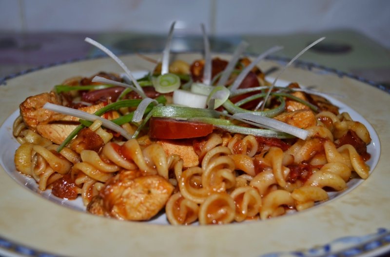 Intr-o oala punem cam 1 l .de apa la fiert si cand apa clocoteste punem pastele la fiert cam 8 minute, apoi le clatim cu apa rece si le punem peste sosul picant. Le mai fierbem inca cinci minute, apoi oprim focul.Pofta buna!