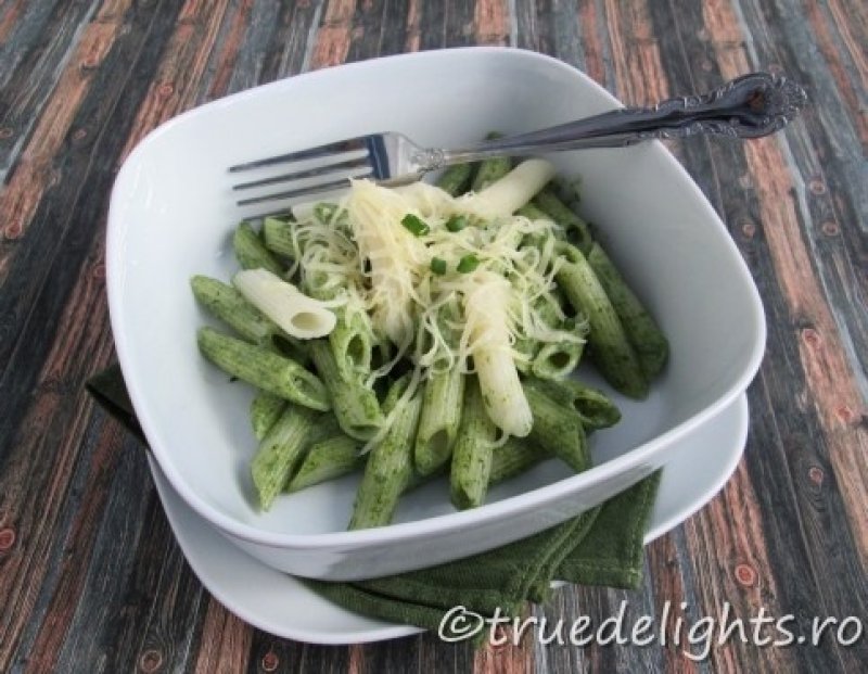 Pastele se scurg de apa, se aseaza pe platoul de servire si se stropesc cu sosul de spanac.