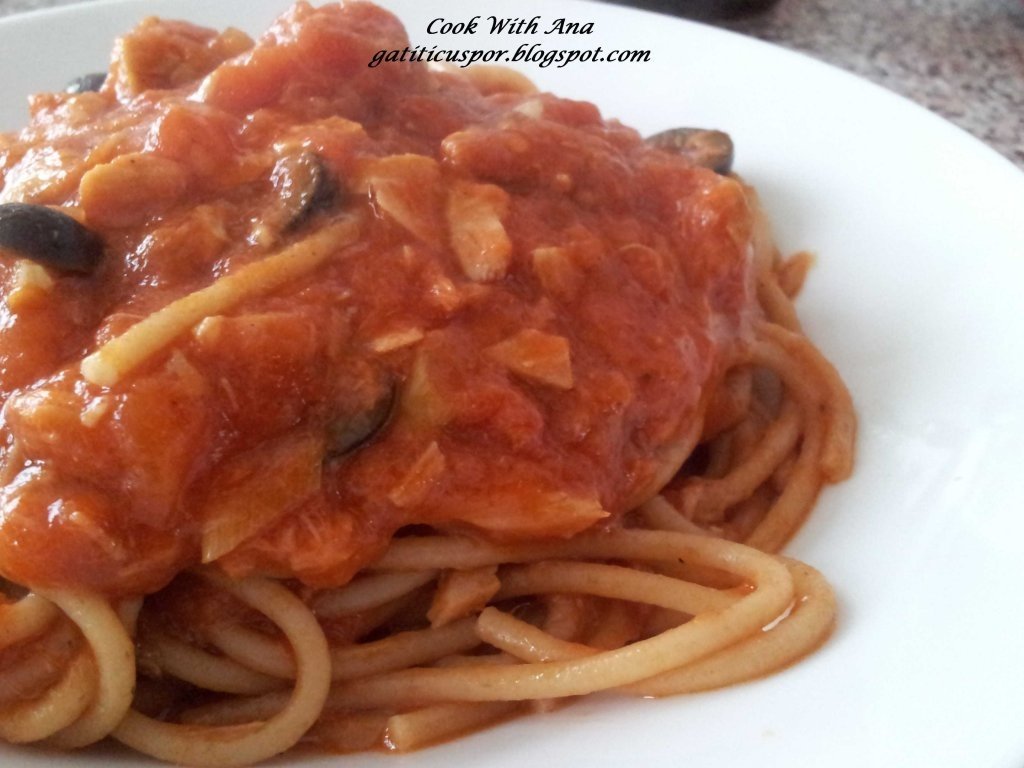 Cand rosiile s-au fiert adaugati tonul scurs si maslinele taiate felii.