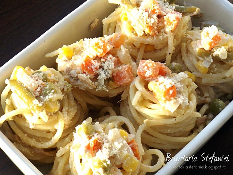 Mai multe detalii puteti gasi si aici: http://bucatariastefaniei.blogspot.ro/2015/02/paste-cu-ton-smantana-si-legume.html