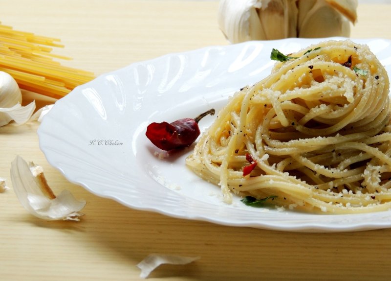 Cand spaghetele sunt fierte al dente se strecoara, avand grija sa se pastreze o ceasca din apa in care s-au fiert si se pun peste usturoi. Se sezoneaza cu sare si piper si se pune tigaia din nou pe foc pana cand se evapora toata apa.
