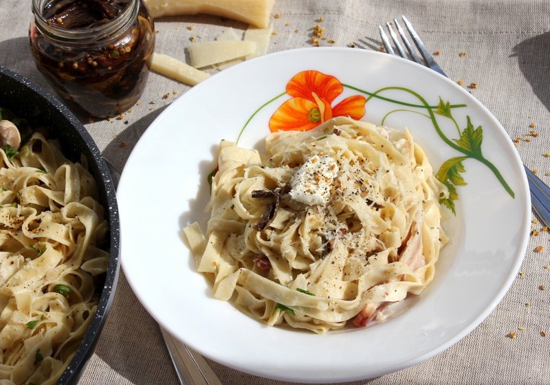 Se lasă la uscat, timp în care se pregătesc celelalte ingrediente. Eu am pregătit pastele cu o oră înainte, apoi le-am pus la fiert, în apă clocotită cu sare și o lingură de ulei. Se lasă 2-3 minute, apoi se scurg și se clătesc cu apă rece. Trebuie fierte oarecum al dente, fiindcă se vor mai găti și în tigaie în momentul în care se adaugă peste celelalte ingrediente. În tigaie se pune la încins o lingură de ulei de măsline.