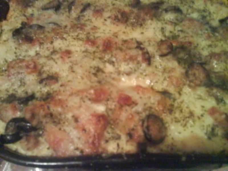 Se incinge uleiul intr-o tigaie in care se caleste ceapa si usturoiul apoi adaugam baconul, ciupercile, ardeii, maslinele, patrunjelul tocat, si rosiile(care au fost decojite si taiate cuburi) se condimenteaza si se calesc aproximativ 5 minute.