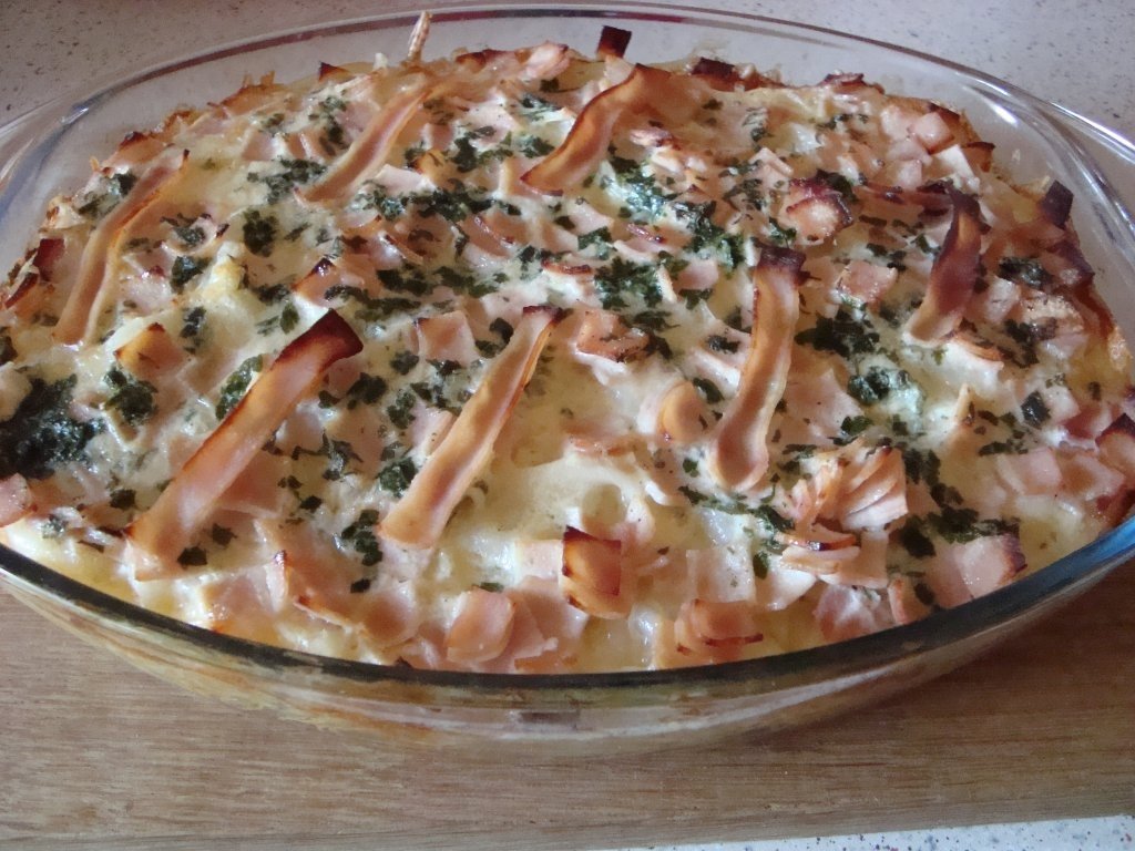 Intr-o tava din yena pui pastele fierte, adaugi apoi sunca si cascavalul, iar apoi dea supra torni ouale batute cu smantana.