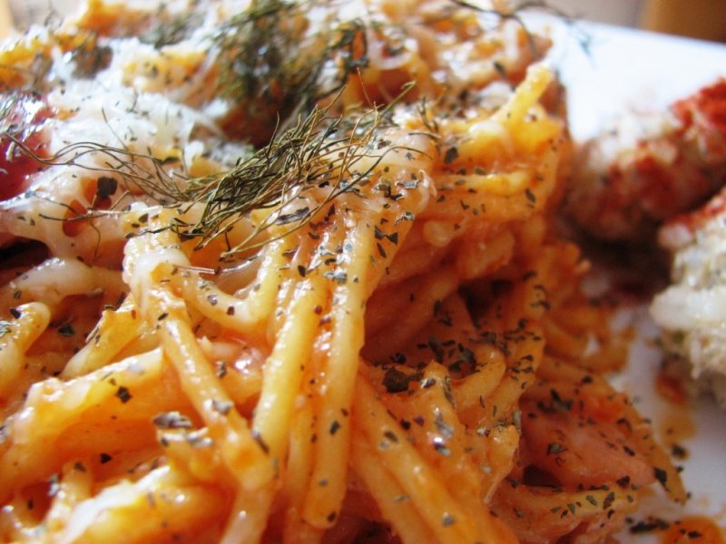 Adaugati oul, apoi sunca taiata cubulete, cam un sfert din cascavalul ras si sosul de rosii. Pastele vor capata o consistenta deosebita. In final, adaugati si busuiocul si mararul.
