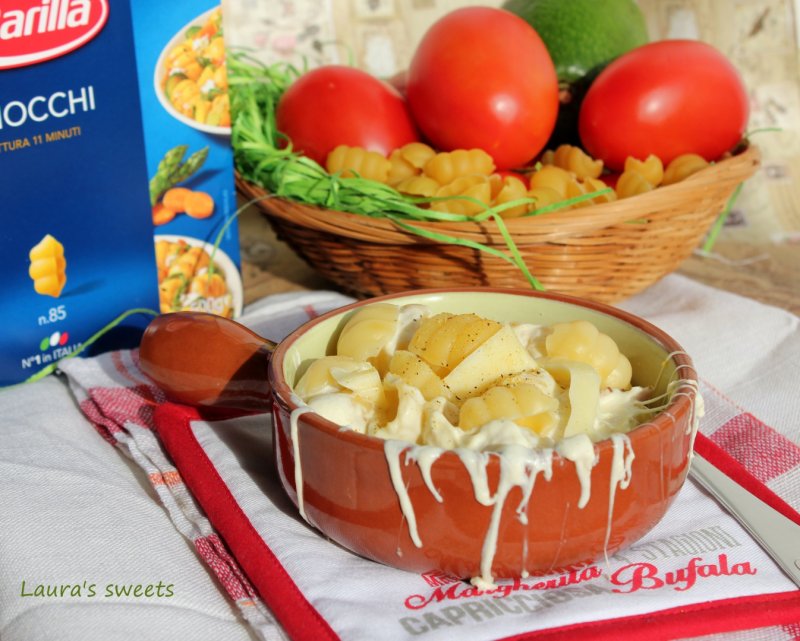 Cascavalul se taie cubulete. Baconul se taie fasii subtiri ca sa iasa crocant.