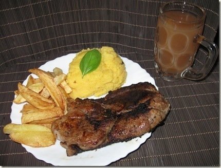 Servim cu cartofi prajiti, mamaliguta, castraveciori murati si must. Prea bun, un adevarat ospat…