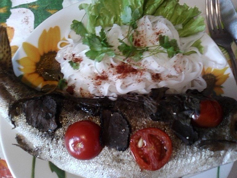 Pestele spalat, il condimentam cu sare si piper,stropim cu zeama de lamaie, lasam 15 minute la frigider,dupa care umplem pestele cu bucati din rosie,usturoi si frunze de menta.Asezam pestii in vas de yena uns cu putin ulei de masline,ornam cu felii de rosie,lamaie, frunze de menta si ciuperca fiarta in vodka. Adaugam vinul,acoperim cu folie de aluminiu si dam la cuptorul incins pentru 20 minute.Servim cu garnitura de paste din faina de orez,pregtite dupa reteta de pe ambalaj.Ornam cu patrunjel proaspat.