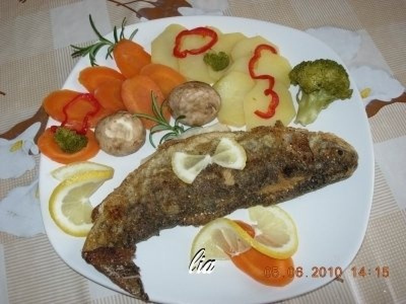Pastravul se serveste cu garnitura de legume fierte si felii de lamae.
