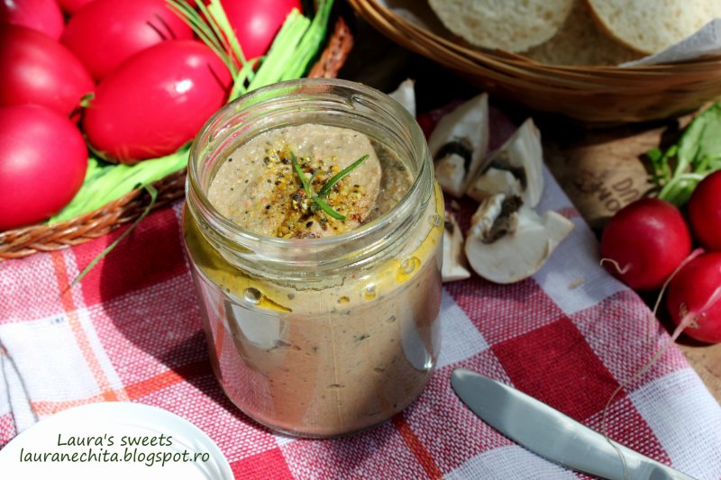 Curatam si spalam ficateii. Curatam si spalam legumele. Tocam cuburi morcovul, ceapa, ardeiul si le punem la calit in putin ulei de masline. Adaugam sare, apoi adaugam ficateii si rosiile uscate. Lasam la rumenit 5-10 minute, ii intoarcem sa se rumeneasca pe toate partile, apoi adaugam ciupercile feliate. Adaugam inca un praf de sare si lasam 10 minute pe foc. Adaugam o cana cu apa si lasam sa fiarba inabusit, pana scade toata zeama. Dupa ce s-au gatit bine. transferam toata compozitia intr-un blender si mixam bine. Gustam, daca mai e nevoie, adaugam sare sau piper. Mixam untul cu un praf de sare si un praf de nucsoara, adaugand cate o lingura de pate, pana il incorporam pe tot. Transferam compozitia intr-un vas de sticla preferabil, nivelam,apoi turnam cateva linguri de ulei de masline, putin piper cu lamaie, un fir mic de rozmarin si dam la rece, acoperit.