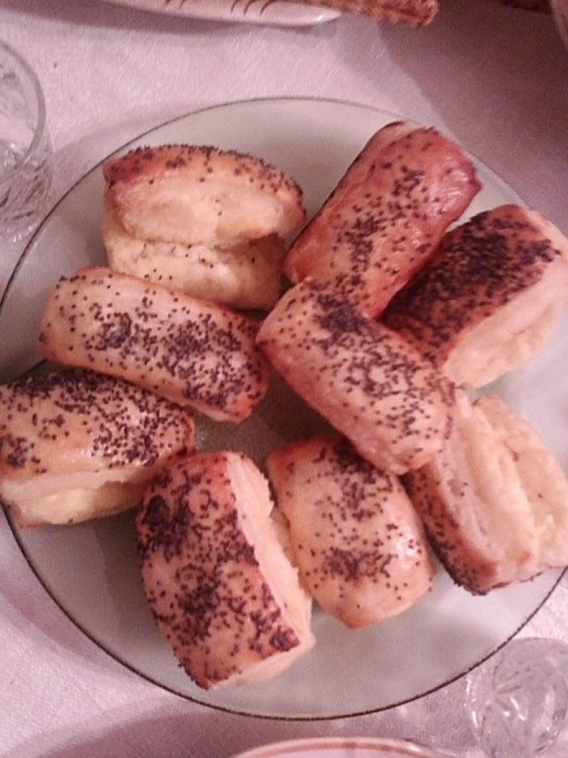 Faci un aluat din margarina, ou, faina si branza. Intinzi o foaie pe care o tai in dreptunghiuri. Din branza de vaci, de oi si ou se btine umplutura.Asezam umplutura din branza sau carnaciori sau ciupercipeste dreptunghiuri. Se lipesc dreptunghiurile la capete. Se ung cu ou batut, se asaza in tava tapetata cu hartie de copt, se presara cu mac sau susan. Se da la cuptorul incins pentru o jumatate de ora.