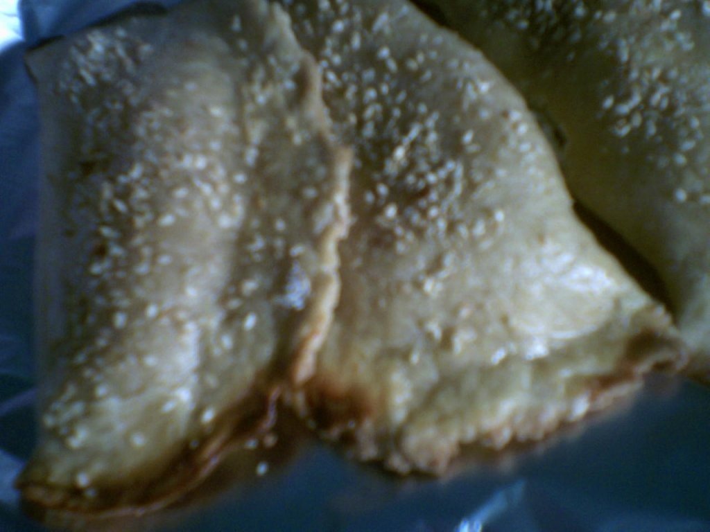 Presasam faina pe masa si rupem bucatele mici de aluat, le intindem intr-o foaie subtire punem umplutura si le impaturim (le puteti face in diferite forme). Le punem in tava, le ungem cu ou si presaram susan, se coc 30 de minute. Cand sunt gata le punem intr-o cratita cu capac.