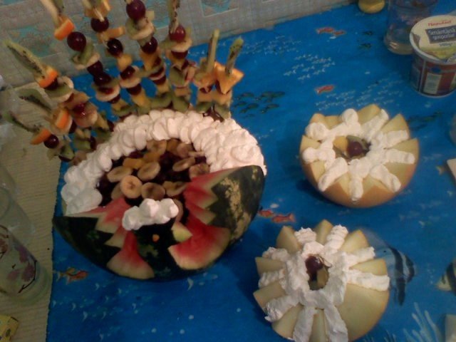 Restul de fructe se taie sub forma unor cubulete se amesteca cu zaharul si putina frisca. Rezultatul va fi o salata gustoasa de fructe cu care se va umple pepenele sub forma de paun.