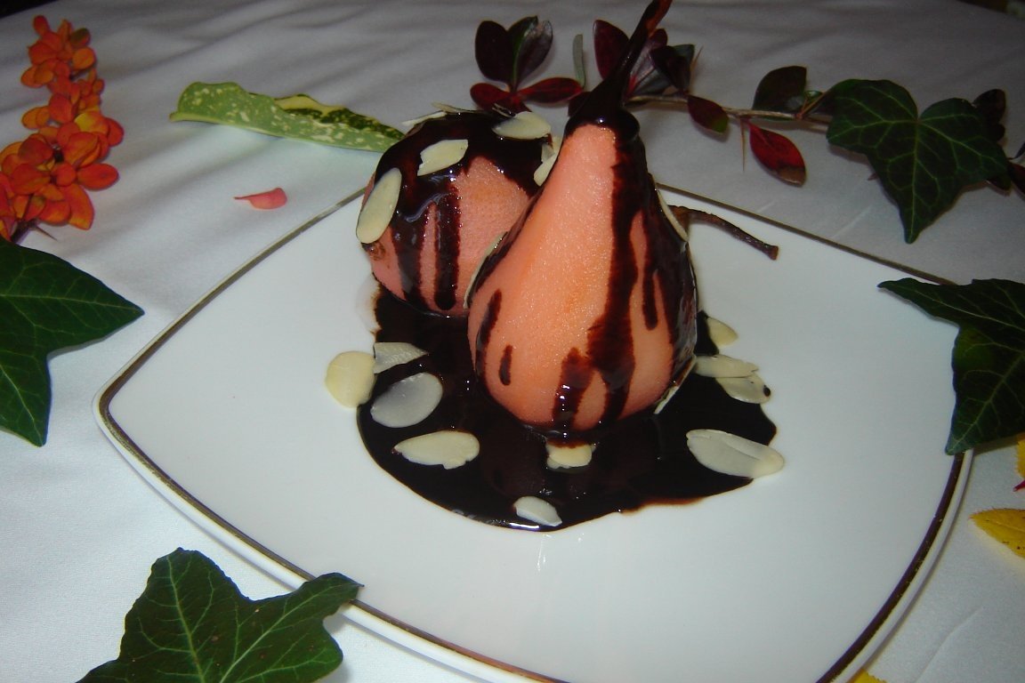 Cand sosul este gata, pe o farfurie,punem perele, le imbracam cu sos si le presaram cu fulgi de migdale.