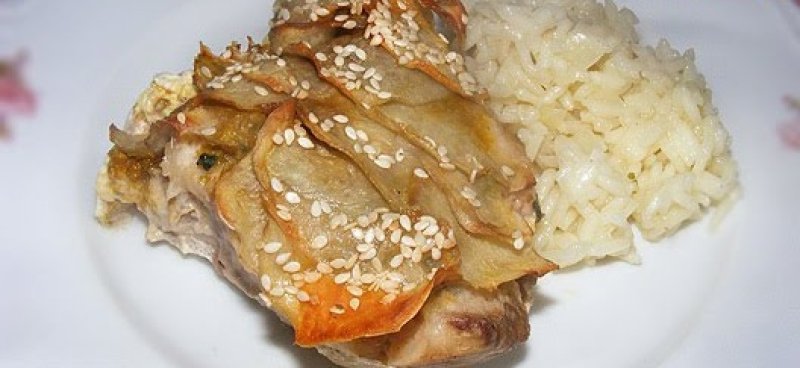Condimentaţi cu curry. Curăţaţi cartoful şi tăiaţi fâşii foarte subţiri (ca pentru chipsuri), apoi aşezaţi-le pe rânduri suprapuse peste carne, ca să formaţi solţi din cartofi. La final ungeţi cu ulei de măsline cartofii şi presăraţi seminţe de susan.