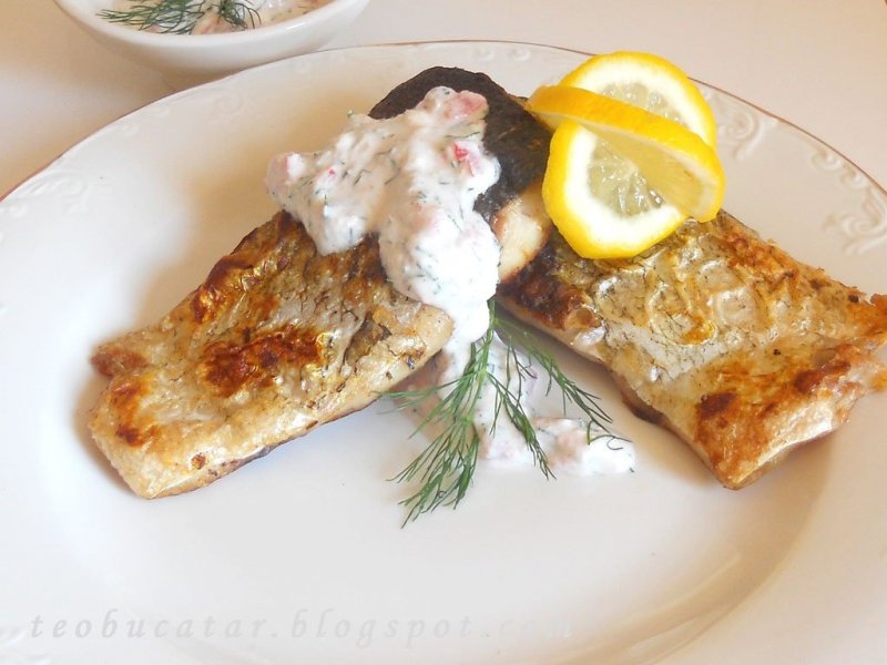 Intre timp, se opareste rosia, se curata de pielita si de seminte si se toaca foarte marunt. Se pun intr-un bol hreanul, zeama de lamaie, iaurtul(smantana), un praf de piper, rosia si mararul verde si se amesteca bine. Sosul este destul de picant, insa merge foarte bine la peste sau chiar pui, vitel.