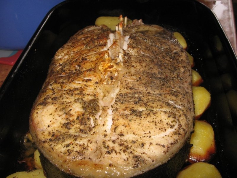 Am luat din Real o bucata de peste (cred ca era somn de Dunare) , cam de 2 kg si l-am gatit in cel mai simplu mod cu putinta , in cuptor, pe cartofi !