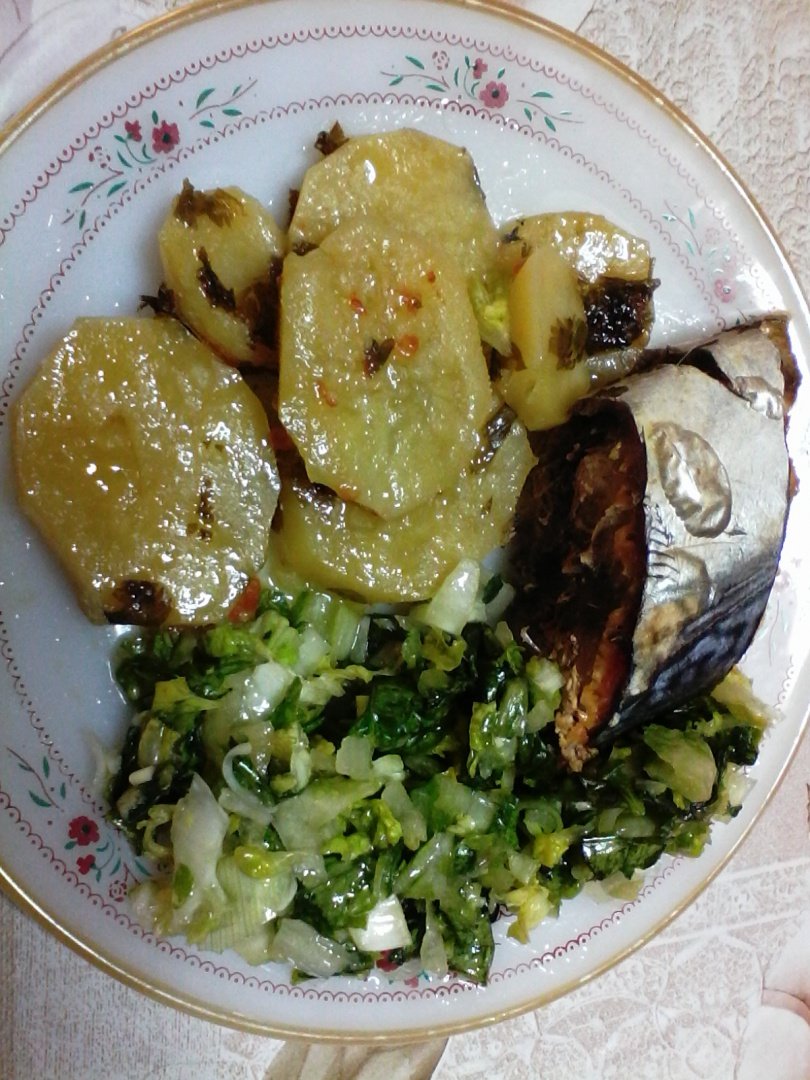 Curatam si spalam pestele. Il taiem si ii punem sare , lasam in frigider toata noaptea. Preincalzim cuptorul la 180 de grade. Curatam, spalam si taiem cartofii si rosiile rondele. Punem pestele , rosiilesi cartofii in vas de yena. Adaugam sare, ulei, patrunjelul taiat marunt si usturoi. Adaugam apa, acoperim tava cu folie de aluminiu si coacem pentru 35 minute. Luam folia si mai lasam 35-45 minute. Servim cu salata.