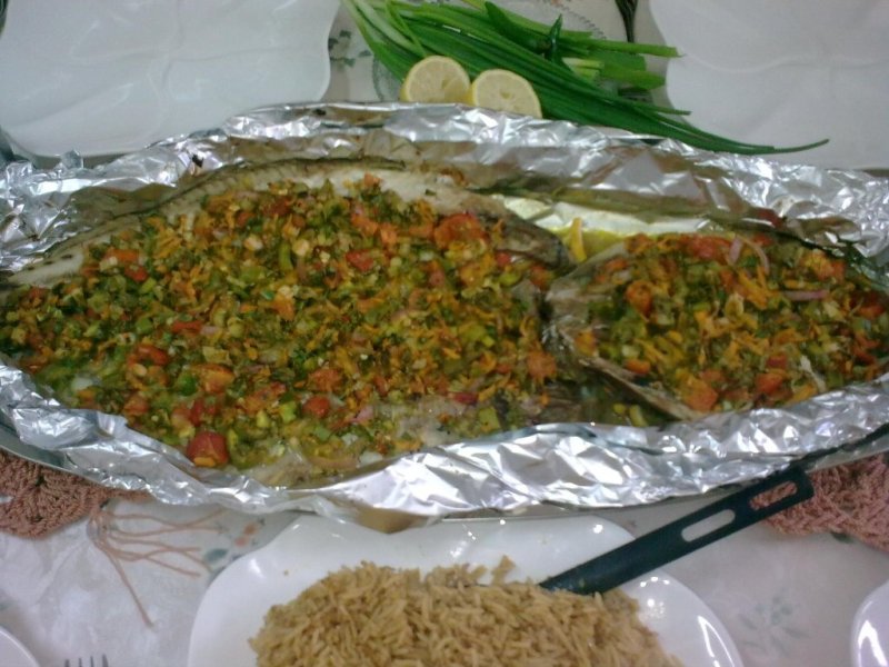 - Se asterne intr-o tava foaie de aluminiu si deasupra ei se aseaza cojile de la lamii taiate dupa dorinta, se presoara cu putina curry, si la urma se stropesc un pic cu ulei de masline...peste toate acestea se aseaja pestele(cu pielea in jos),ce e desfacut de la spate, se toarta peste el umplutura de legume. Foaia de aluminiu o adunam incet cu mina dupa forma pestelui si o inchidem incet si atent,dar lasam deschisa la mijloc deasupra pentru a nu se aduna prea multi aburi.(Totusi inauntru se va aduna ceva suc de la legume si supa de la peste),daca nu doriti aceasta supa ce se va forma inauntru puteti lasa pestele neinvelit.Se tine la rola circa 1-1.30 ora. Cu jumate de ora de a fi scos din rola se aprinde grilul de sus a rolei si se lasa pentru a se rumeni totul.