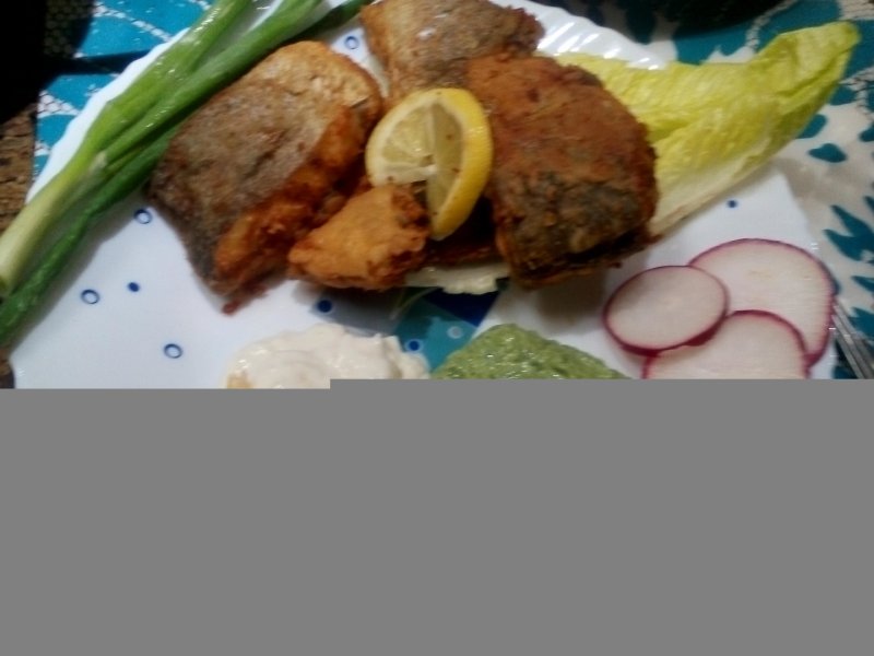 Dupa aceste mici detalii sa trecem la modul de preparare. Pestele gata curatat se spala si se taie in 3 sau 4 bucati, depinde de marimea lui, apoi se usuca putin.Se stropeste cu zeama de la o lamaie si se condimenteaza cu cumin, piper, usturoi pisat, sare, desigur pe ambele parti si in interior. Se pune pe un platou, se acopera si se lasa la rece 20-30 minute.Dupa 30 de minute, bucatile de peste nu se scurg de acel sos marinat ce s-a format si se dau prin faina pana toata suprafata e bine acoperita apoi se bat usor intre palme pentru indepartarea surplusului de faina. Se prajesc intr-o tigaie incinsa cu ulei la foc mediu;bucatile de peste se prajesc bine pe ambele parti, pana cand au prins o crusta crocanta la suprafata care se desprinde usor.Dupa ce s-au rumenit bine pe ambele parti se vor aseza pe prosoape de hartie pentru a se inlatura surplusul de ulei.Pestele prajit se serveste imediat, cu sos de usturoi, lamaie, pasta de patrunjel cu tahini(baqdunsye)si garnitura de cartofi prajiti cu sau fara mamaliguta(dupa preferinta).