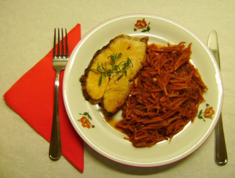 Calim in ulei ceapa taiata marunt, punem morcovii taiati bastonase, sosul de rosii, vinul si mierea. Potrivim de sare si piper. La urma adaugam cele doua crengute de rosmarin si acoperim vasul cu un capac pentru ca sosul sa primeasca aroma.
