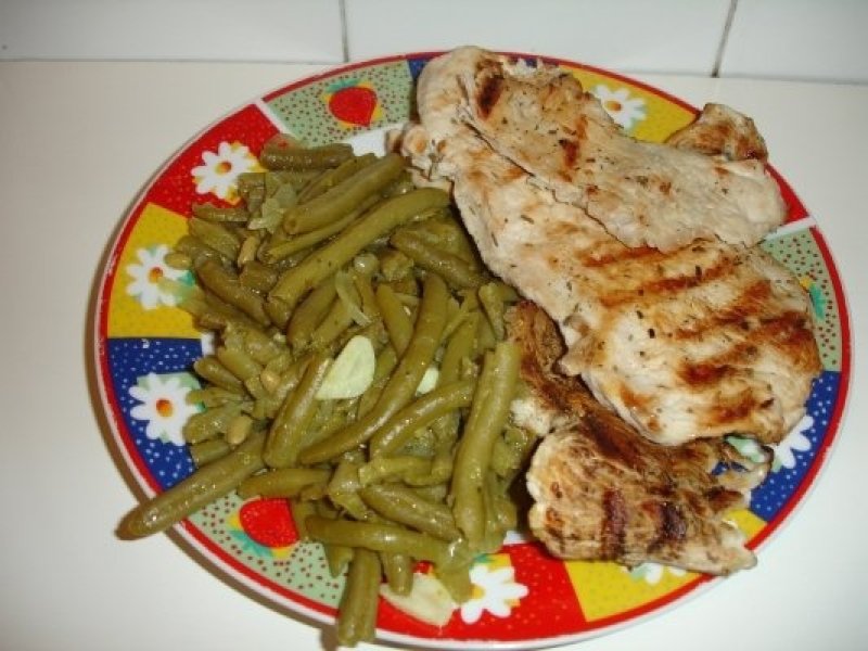 Se coace pe ambele parti si se serveste alaturi de fasolea pastai,dupa dorinta cu mujdeii de usturoi sau cu zeama de lamaie peste pieptul de curcan.