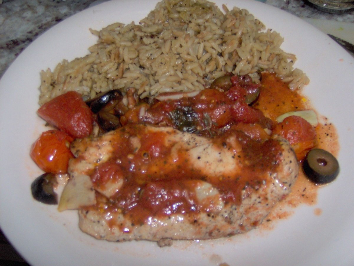 Intr-un bol turnam 2 linguri ulei de masline, putina sare, piper si ramurile de cimbru proaspat. Amestecam bine si punem pieptul in ulei si lasam pentru 1/2 de ora. Intre timp, intr-un vas rezistent la cuptor turnam conservele de rosii, adaugam si rosioarele, sare, piper, maslinele taiate, amestecam bine si dam la cuptorul incalzit la 200 de grade pentru 10 minute pentru ca sosul sa se coaca usor.
