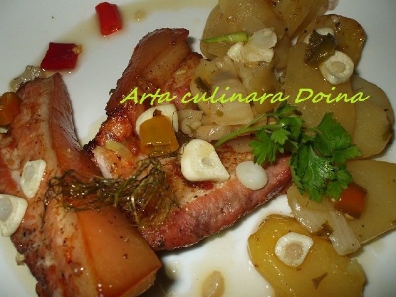 Scoateti pe un platou cartofii, asezati carnea deasupra, decorati cu verdeturi, feliute de usturoi si de peperoni. Turnati in platou si putina zeama ramasa in vas.