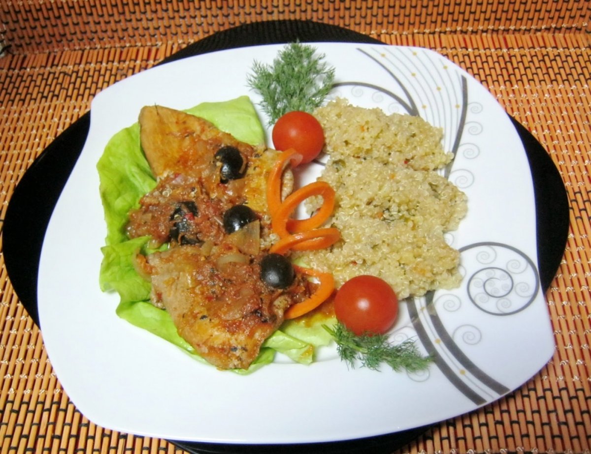 Servim pieptul de pui cu masline alaturi de pilaful de quinoa si ornam dupa imaginatie.