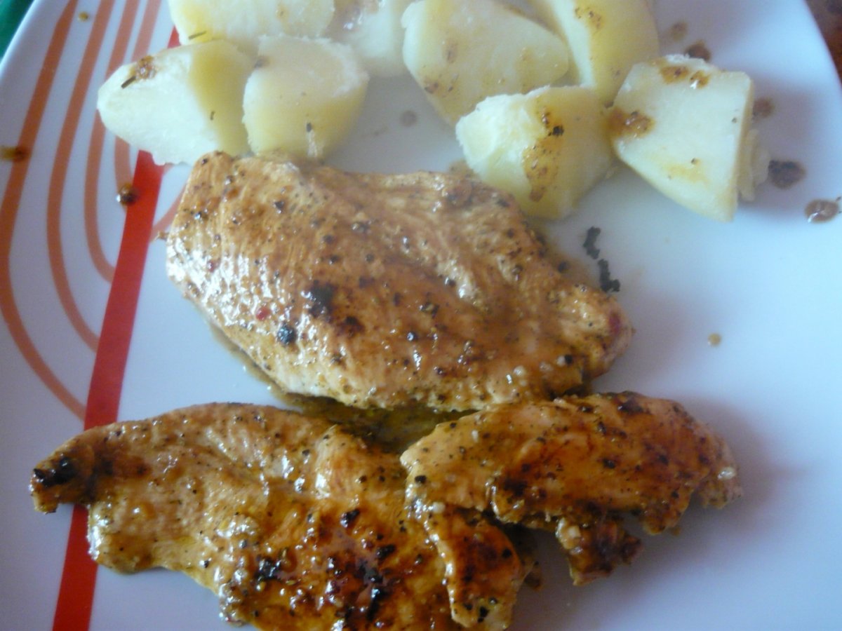 Se face un mix de condimente din zeama de la lamaie, sare, piper si condimentele ptr. carne de pasare si se unge carnea de pui.