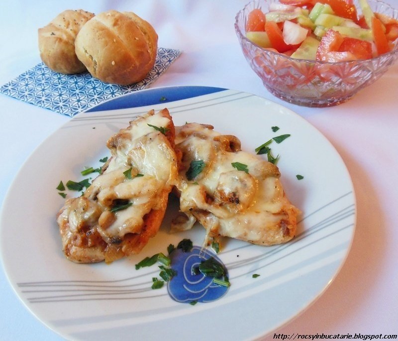 Asezam in el bucatile de pui, peste punem compozitie cu ciuperci, iar deasupra cascavalul dat prin razatoarea cu ochiuri mari.