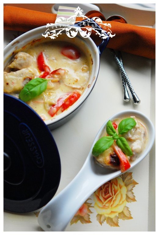 Puneti acest sos peste pui si coaceti la 230 de grade pentru 10 minute.