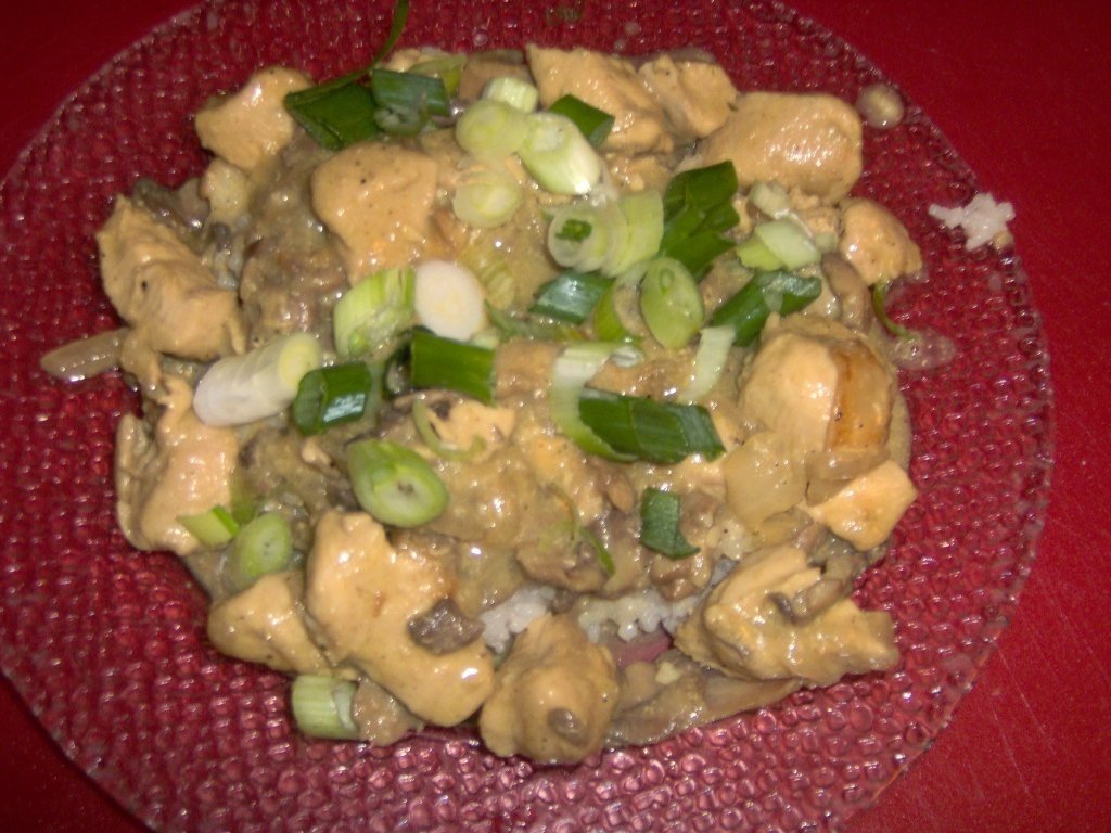 Intr-o cratita lata nu prea adanca se incalzeste uleiul se prajeste usor ceapa,se adauga usturoiul si ghimbirul si se amesteca din cind in cind se adauga ciupercile se prajesc putin si la urma fasiile de piept si se prajesc pina devin albe.Se da la gust cu sare,piper si pasta de cary,se adauga laptele de cocus se amesteca si se lasa pe foc mic 5-10 minute.