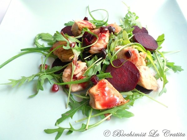 7. Scoatem pieptul de pui, il punem pe o farfurie, punem rucola iar deasupra punem sosul de rodie si cateva fructe de rodie proaspete.