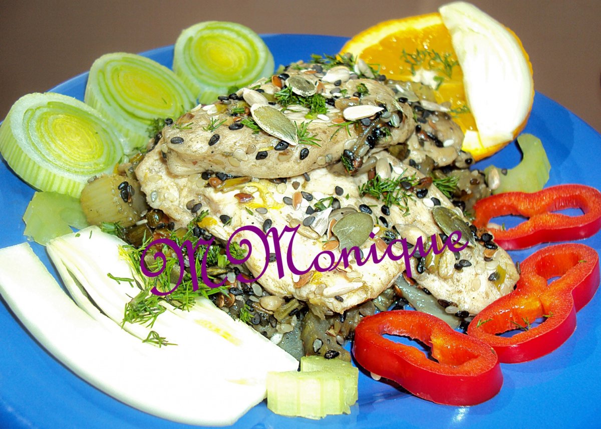 Într-o cratiţă adăugaţi celelalte patru linguri de ulei, iar, când este încins, adăugaţi prazul, feniculul, apio şi ardeiul tocat. Presăraţi deasupra un sfert de linguriţă de sare şi piperul negru. Căliţi puţin legumele apoi adăugaţi fâşiile de pui rumenite. Amestecaţi toate ingredientele, apoi adăugaţi seminţele de dovleac, floarea soarelui, susan negru şi alb şi stoarceţi zeama de la portocală. Amestecaţi din nou şi adăugaţi piperul roşu şi mărarul tocat.