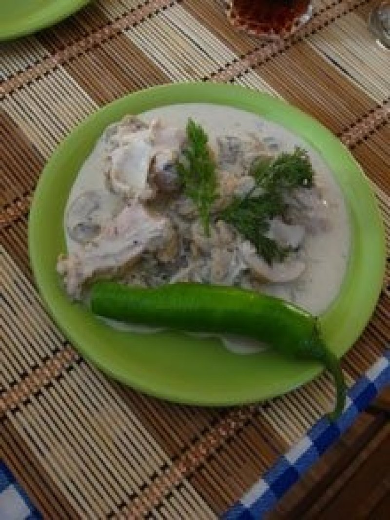 Se caleste putin ceapa,se adauga bucatile de piept se prajesc impreuna si se presara putin maggi granula.Dupa care se toarna smantana si se da deoparte.Se poate condimenta cu piper alb doar pentru a nu strica aspectul cu cel negru.