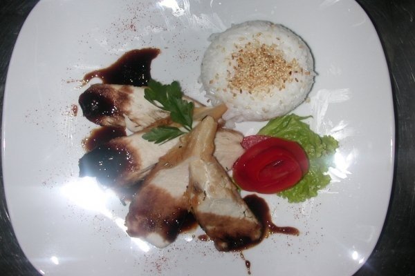 Pentru asezarea in farfurie se taie pieptul de pui in fasii transversale,se pune sosul peste carne, orezul se aseaza langa carne, iar peste orez se pun semintele de susan