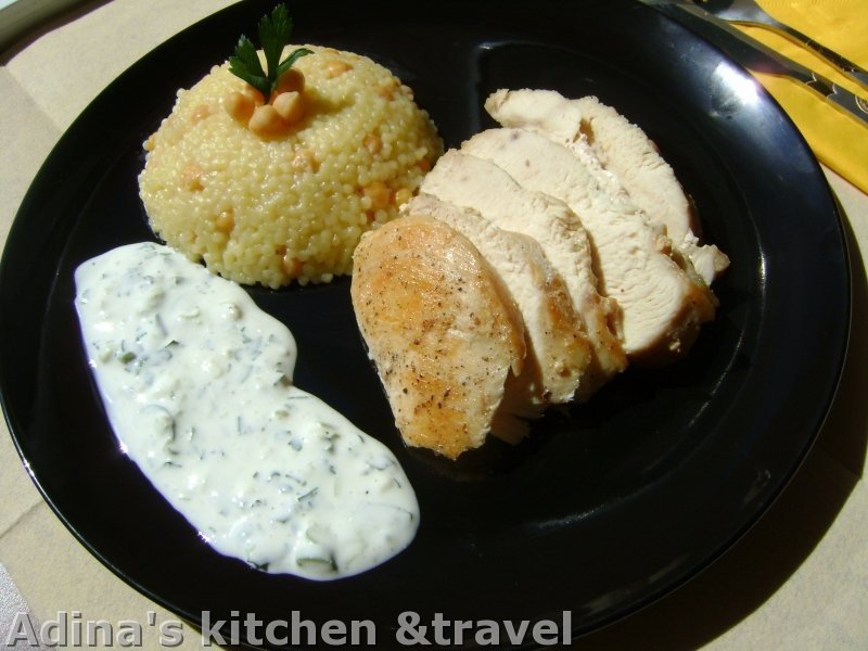 Pregatim fiecare farfurie pentru servit cu piept de pui feliat,sos racoritor si garnitura de cus-cus cu naut.