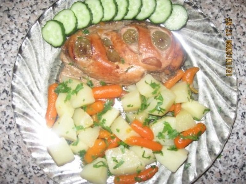 Separat se face urmatorul amestec:cafeaua se amesteca cu piperul, sarea si zaharul. Bucatile de piept se tin la macerat in acest amestec circa 2 ore dupa care in fiecare crestatura se aseaza cate o boaba de strugure(se poate folosi mere, portocale,mandarine). Se aseaza carnea intr-o cratita in care am pus putin ulei si putina apa si se da la cuptor circa 20-30 min. Cand carnea este rumenita se scoate din cuptor si se serveste alaturi de o garnitura. Eu am folosit drept garnitura cartofi natur si mini carote.