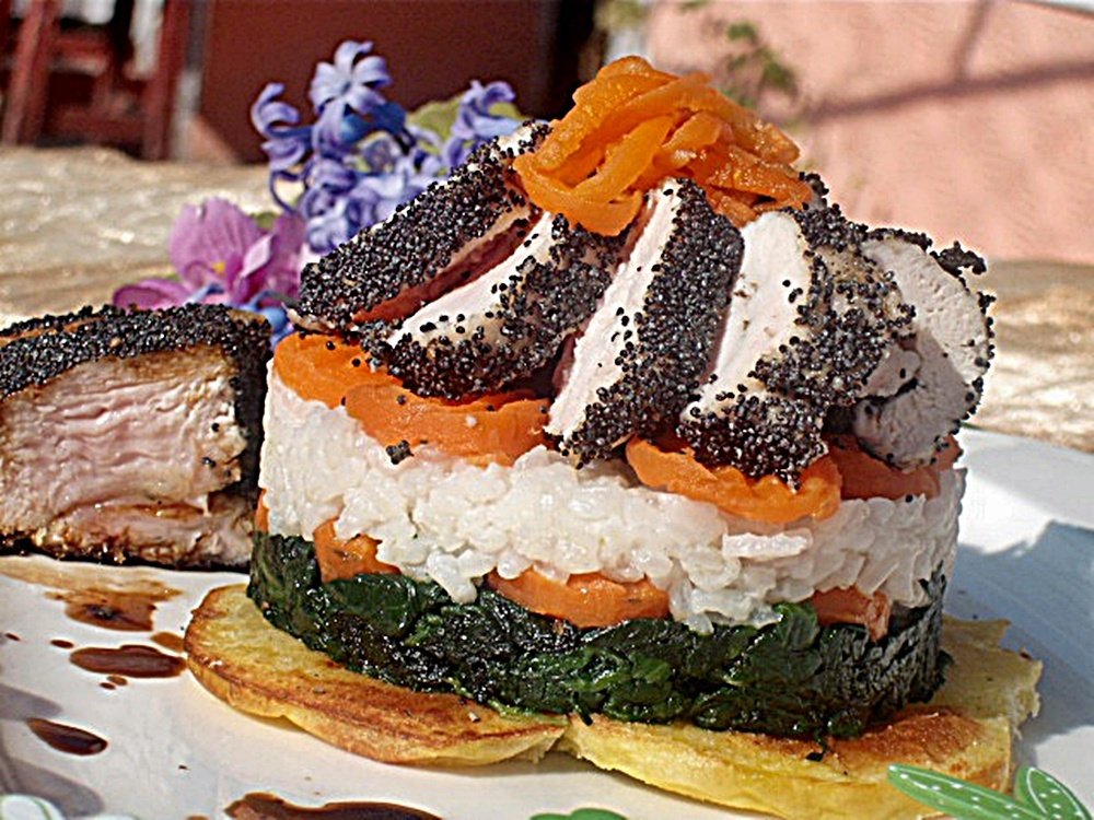 3.Se monteaza pe platou 3-4 rondele de cartof fiert(eu le-am rumenit un pic la cuptor) apoi spanacul calit ,deasupra un strat de rondele subtiri de morcov,deasupra se aseaza orezul fiert,iar un strat de rondele de morcov si la urma feliute subtiri taiate din pieptul de pui in crusta de mac.